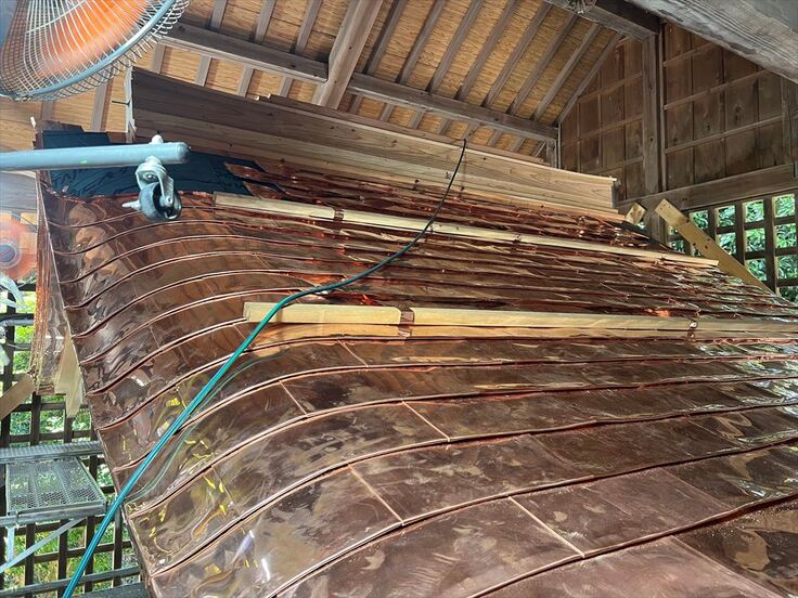 7月10日には、破風や屋根の銅板葺きが進められました。新しい銅板の輝きがとても美しく、これから時を重ねて風格を増していくことが期待されます。