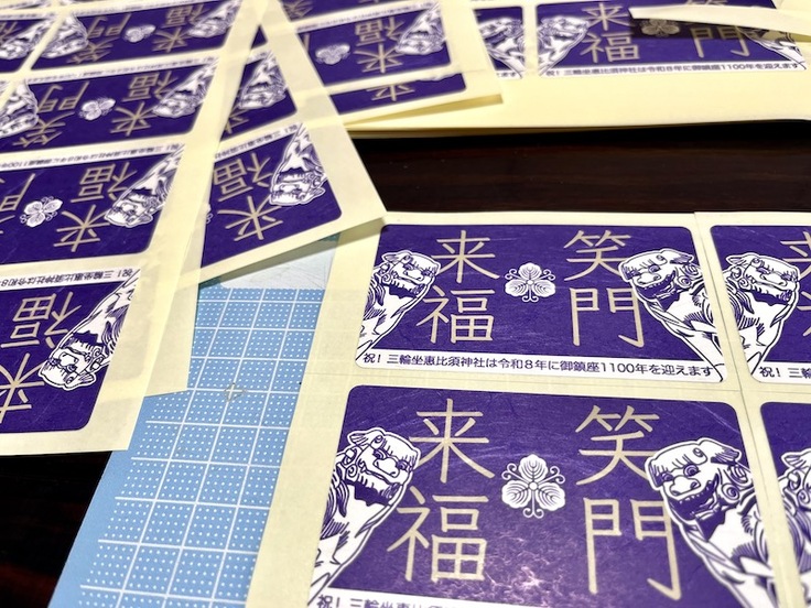 プロジェクトの旗振り人である菊田も獅子舞メンバーとして出演予定でしたが、三輪坐惠比須神社様の来年の御鎮座1100年に向けての広報活動として、ギリギリでしたが狛犬様デザインのステッカーを用意させていただいたので、当日の配布が間に合うように袋詰め等の作業に没頭し……