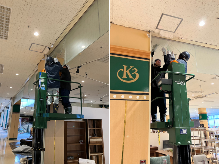 地震による被害を受けたファニチャーパークケースリーの建物・設備をお客様が安心してお買い物できる状態にするための修繕を行う。 天井材補修 スプリンクラー設備の点検と修理 防炎垂れ壁の修復 床工事 電気工事