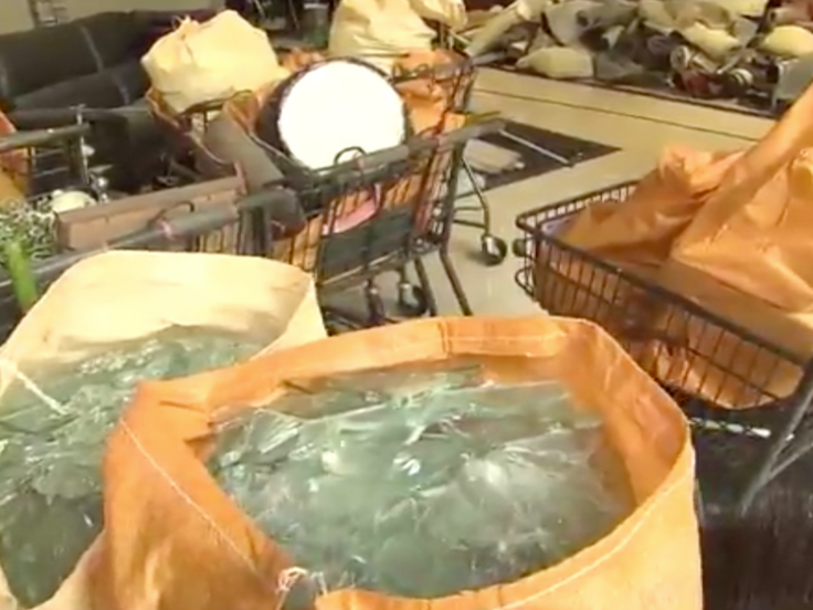建物は各所で天井や壁が剥がれ落下し、火災の際延焼を防ぐために天井に設置された防炎ガラスも数百枚が落下して、割れたガラスが商品を含め至る所に散乱していました。加えて地震の影響でスプリンクラーが誤作動し、店内ほぼ全てが水浸しになりました。