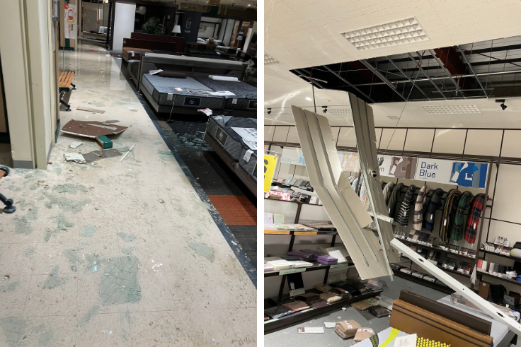 また、揺れによる棚からの商品の落下や倒壊に加え、これら建物の損壊が店内に並ぶ商品にも影響を及ぼし、天井材落下時に発生した粉塵や割れたガラスが商品の上にも散乱し、ここにスプリンクラーの水も加わり、特に店内2階に置いてあった大型家具と呼ばれるソファやダイニングセット、ベッドなどの商品は8割ほどが何らかの影響を受けました。販売できなくなってしまった商品も数多くあります。