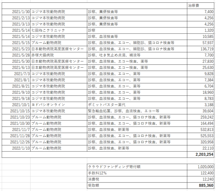 飼い猫がこのような病気になり気持ち的にも経済的にも受け止めきれなかった状況で、たくさんの方から励ましとご支援いただけたこと、人生で忘れられない貴重な経験をさせていただきました。