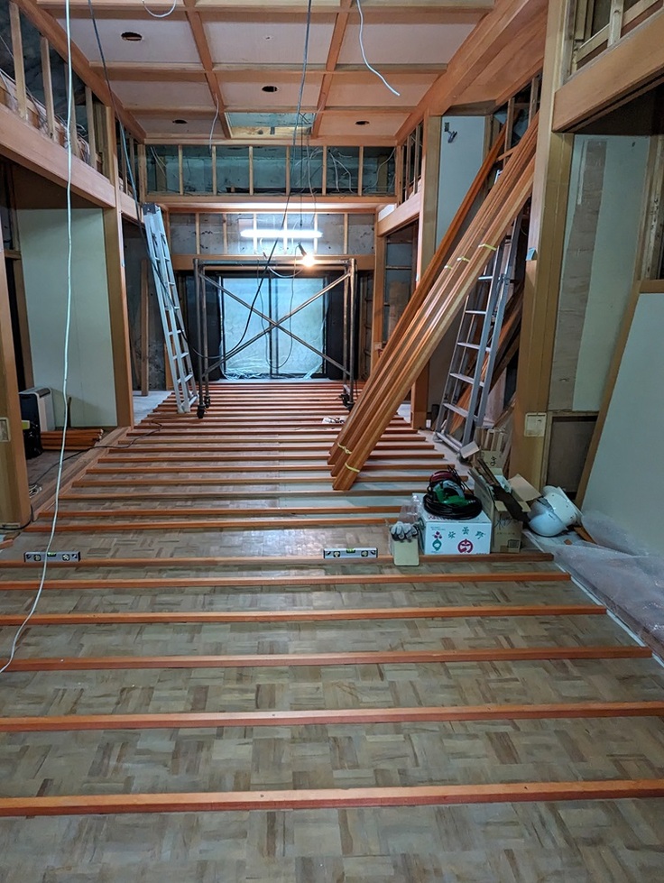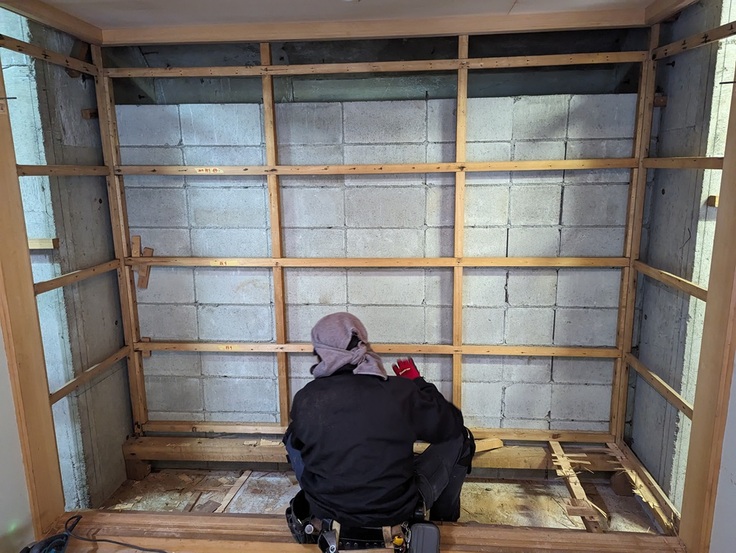 ご報告が遅れましたが、当初予定していた既存の壁に桐を貼る工事から、一度既存の壁を剥がして、断熱材を入れてから新たに壁を作りその上に桐を貼ることになりました。また、換気設備を導入する工事へと大幅に変わりました。