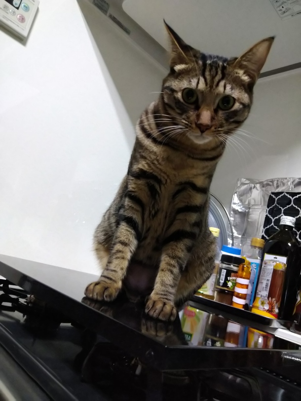 ガスコンロカバーの上から皆んなを見ていたり