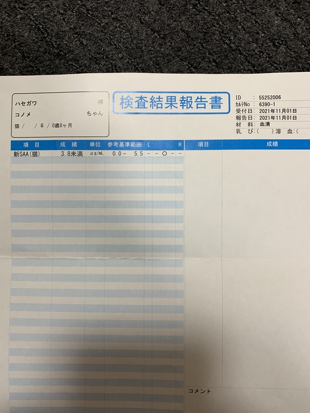 土曜日に外部の血液検査結果を動物病院に取りに行きました。