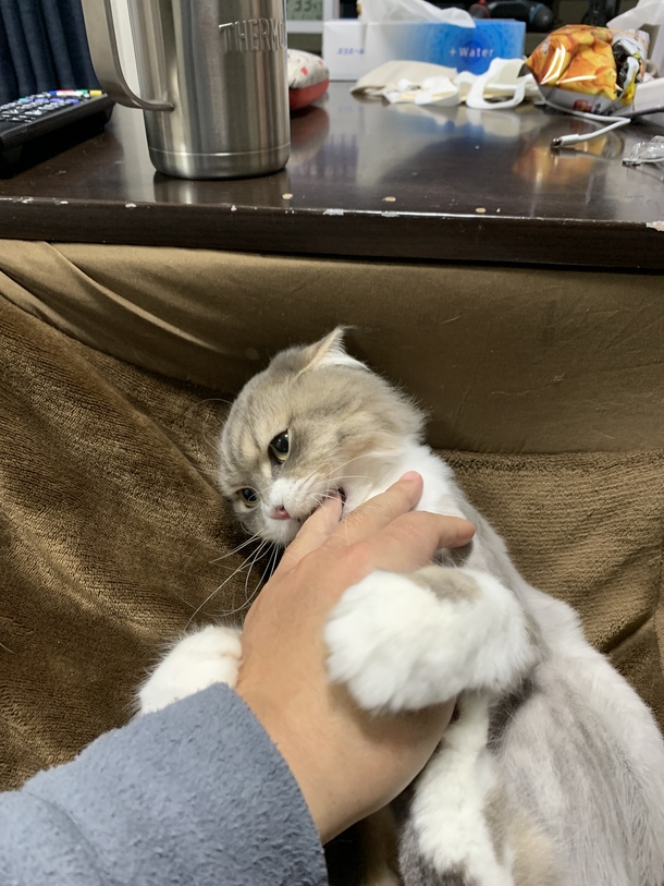 このめ、自分から膝に乗ってきたのに、撫でていると、急に怒って噛んできたりするのですが、そんなもんでしょうか😭