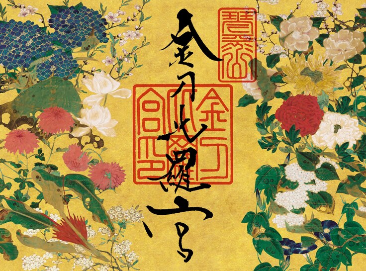 金刀比羅宮所蔵 伊藤若冲筆「百花図」の中でも特に色彩豊かな花の図柄を選び、四季を彩る花々が力強く咲き誇る様を表現しました。花弁が見えるレイアウトは、風格ある雰囲気を醸し出し、印を引き立たせています。花々と金の光沢が美しい御朱印です。