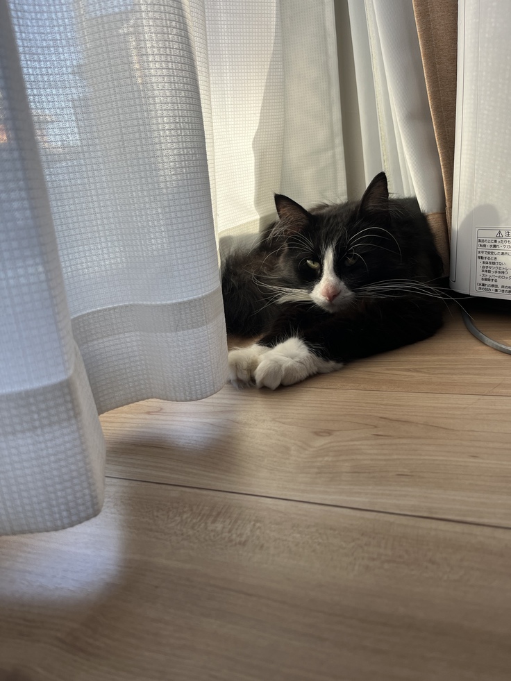 お気に入りのお昼寝スポットは空気清浄機とカーテンの間です