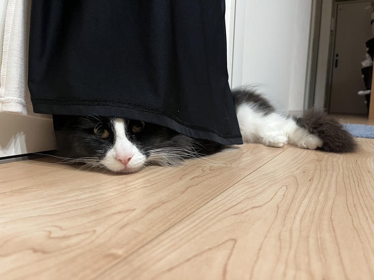今日はお魚屋さん店番中のコロちゃん🐟と取り込んだ洗濯物に隠れてるつもりのコロちゃんです👕