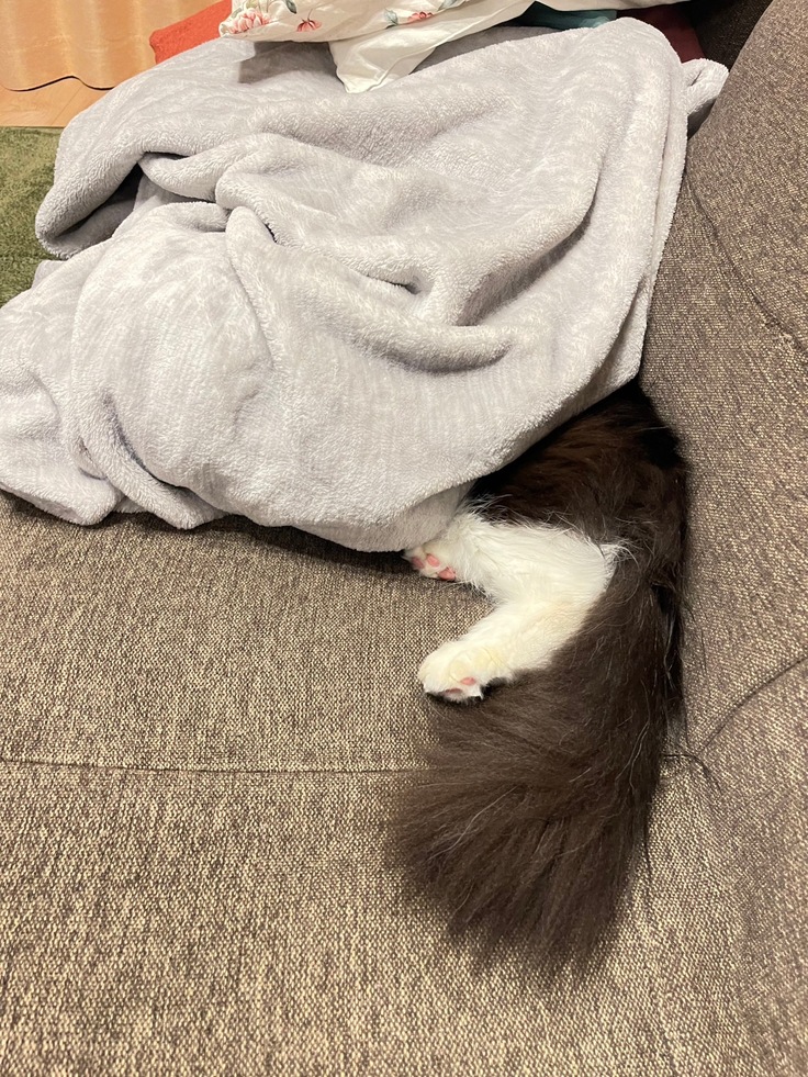 毛布でかくれんぼ!お尻と尻尾が隠れてないよ??と思っていたらどうやらこのまま眠ってしまったようです🐈⬛💤