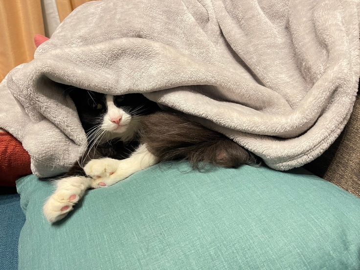 探したらクッションと毛布の間でウトウトしていたようです🐈⬛💤