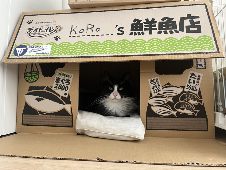 今日の写真はおもちゃで遊ぶコロちゃんと久しぶりに鮮魚店を開いたコロちゃんです。