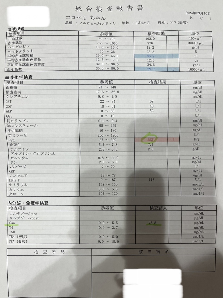 3枚目の写真が血液検査の結果ですが、CPKの数値が高く、何らかの筋肉の損傷があるようです…。