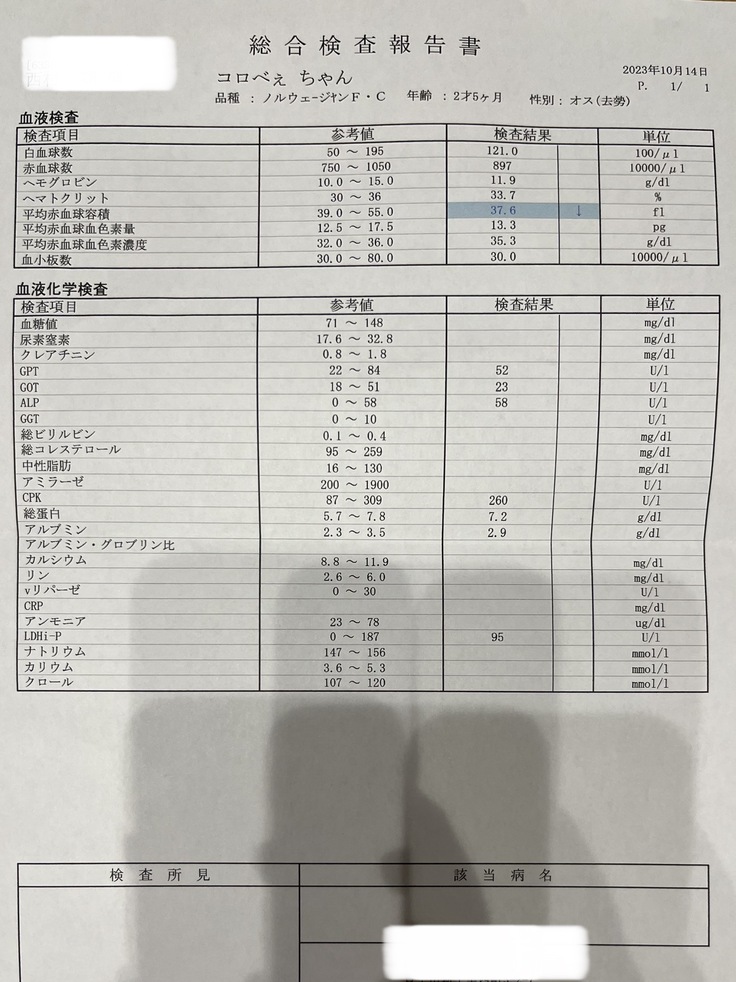 びっくりして筋肉が萎縮したり、筋肉痛でも上がる数値になるので、コロちゃんの場合は病み上がりで前日夜の大運動会が起因しているのではないか?とは疑っていますが、原因は分からず…。