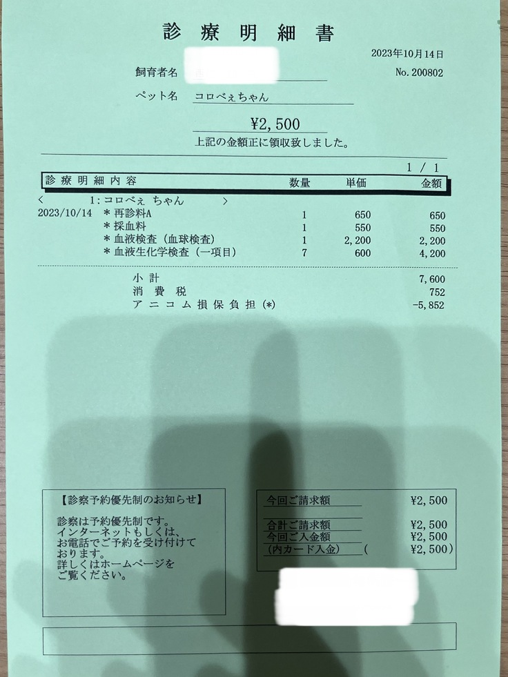 本日の診察料は保険を使用して2,500円でした。この間保険更新しましたが、保険様様です😭