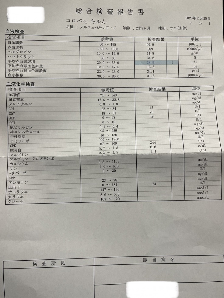 血液検査の結果は特に異常もなく、1番心配していたCPKの数値も参考値内に収まり、ホッとしました。