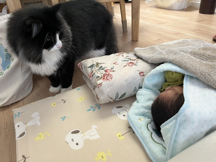 実家に行く前に少しだけ自宅に滞在したのですが、コロべぇは初めは怖がっていたものの、1時間ほどで慣れてくれ、立派にお兄ニャンをしてくれていました。