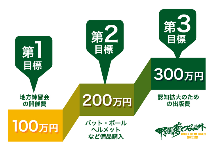 甲子園 夢プロジェクトの練習会を地方3都市で開催します。集まった資金は、練習会のスタッフの旅費、宿泊費、会場費に使用いたします。