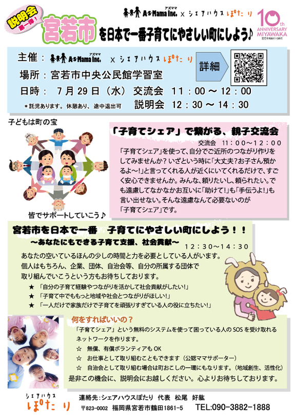 現代版ご近所同士の助け合いのインフラを構築しているAsMamaの「子育てシェア」(http://asmama.jp/)を広めるため、「子育て応援宣言」運動を起ち上げました。「子育てシェア」とは同じ園や学校に通うママ・パパ友達や顔見知りの友達と繋がって、子どもの送迎や託児を頼り合う仕組みです。私達はこのシステムを広めるために、交流会や説明会も実施しています。
