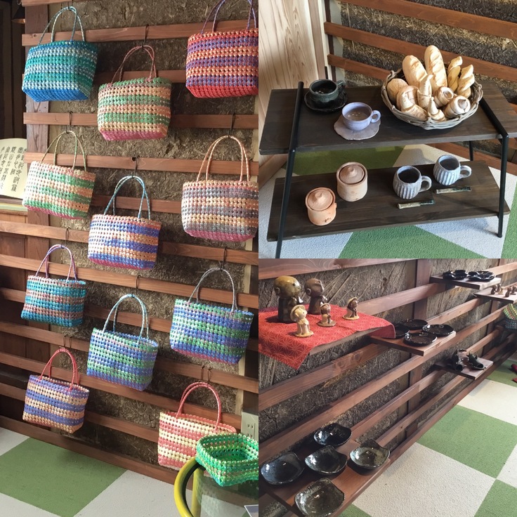 鹿野の土で焼いた『鹿野陶芸教室』の作品はギャラリーの土壁に映えます。