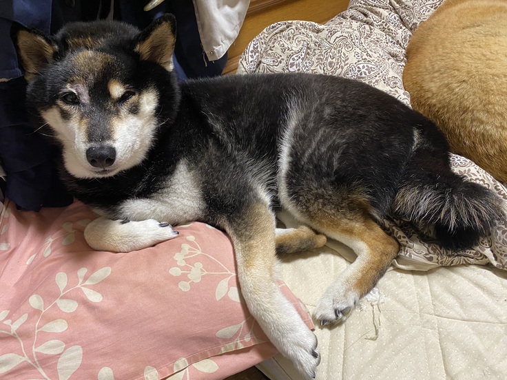 眠いだろうに、横たわって頭を上げたままうとうとするたまけで、頭を布団につけようとしない。