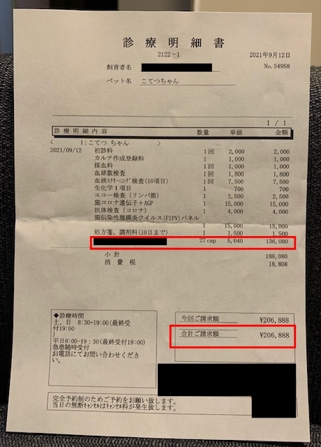 (9月12日FIP診断をされた病院での診察費用と海外薬費用)