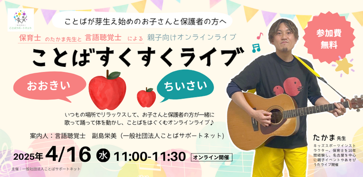 皆さまからのご支援で無料開催が決まりました4月のオンラインイベント「ことばすくすくライブ♪『大きい』『小さい』」の参加受付も開始となりました。