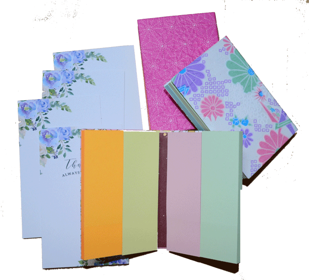 下の写真は今回のリターンの一部、サンクス・カードとオリジナル付箋セットです。