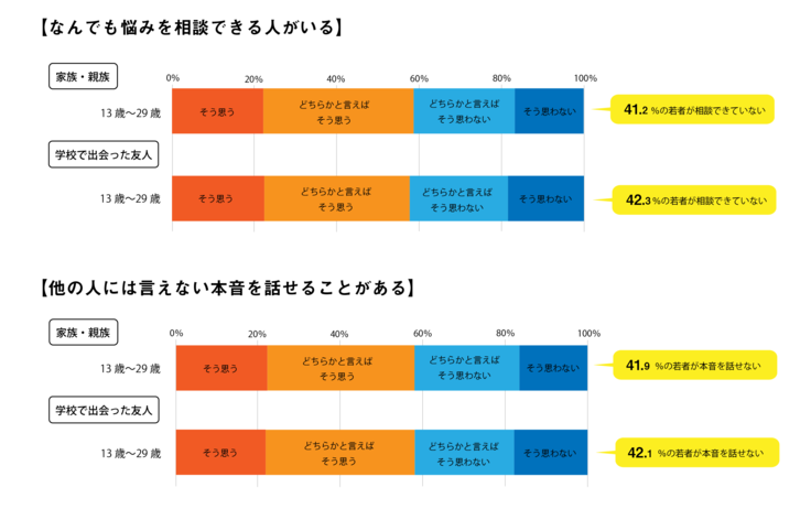 内閣府の統計データでは、家族・親族や友人との関わりの中で「何でも悩みを相談できる人がいる」「他の人には言えない本音を話せることがある」という質問に対して「どちらかというとそう思わない」「そう思わない」と答えた13歳~29歳の若者は、いずれも全体の4割を超えていました。