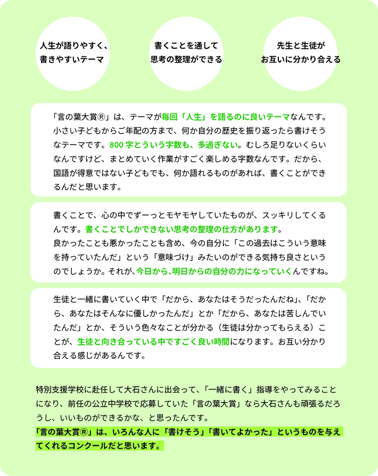国語学習だけでなく、人間として必要な「生きる力」を養う800字の作文。「言の葉大賞Ⓡ」は、いわゆる「きれいな」作文を顕彰するだけのコンクールではありません。