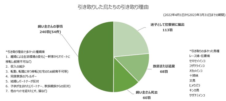 飼い主さんから引き取るご事情として最も多いのは「離婚により生活や環境が変わったことによる引き取り」で、次いで「収入の減少」や「転勤、転職に伴う移転」、「同居している家族にアレルギーが出た」などがあります。