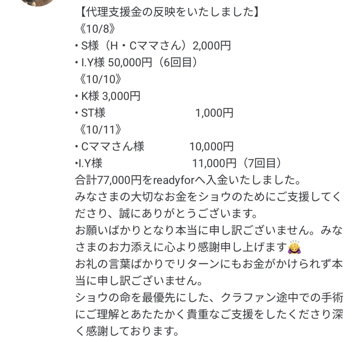 10月7日までに代理支援にてご支援いただきました下記のご支援金をreadyforへ入金いたしました。