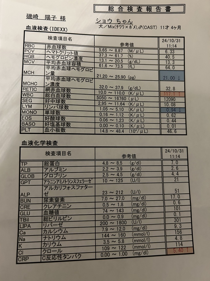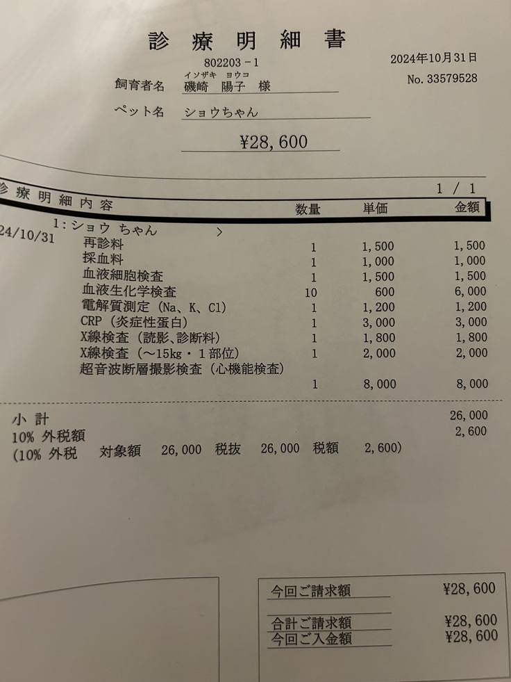 10月31日にショウの手術後の1ヶ月検診に行ってきました。
