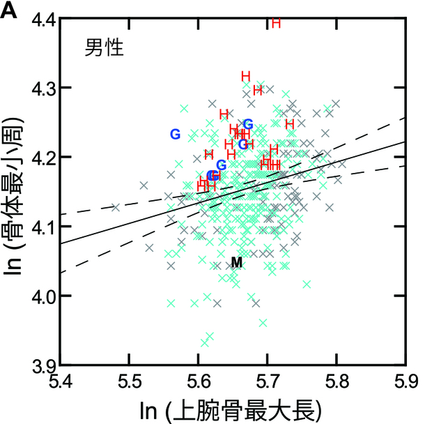 サンプルは縄文(水色の×)及び弥生・古墳時代人(グレーの×)の男性の上腕骨で、図中の斜めの実線は全サンプルに基づく回帰直線、つまり「ある長さなら周の平均的状態はこれくらい」ということを表示します。回帰直線の上に来る個体は「平均以上に太い」とみなせます。