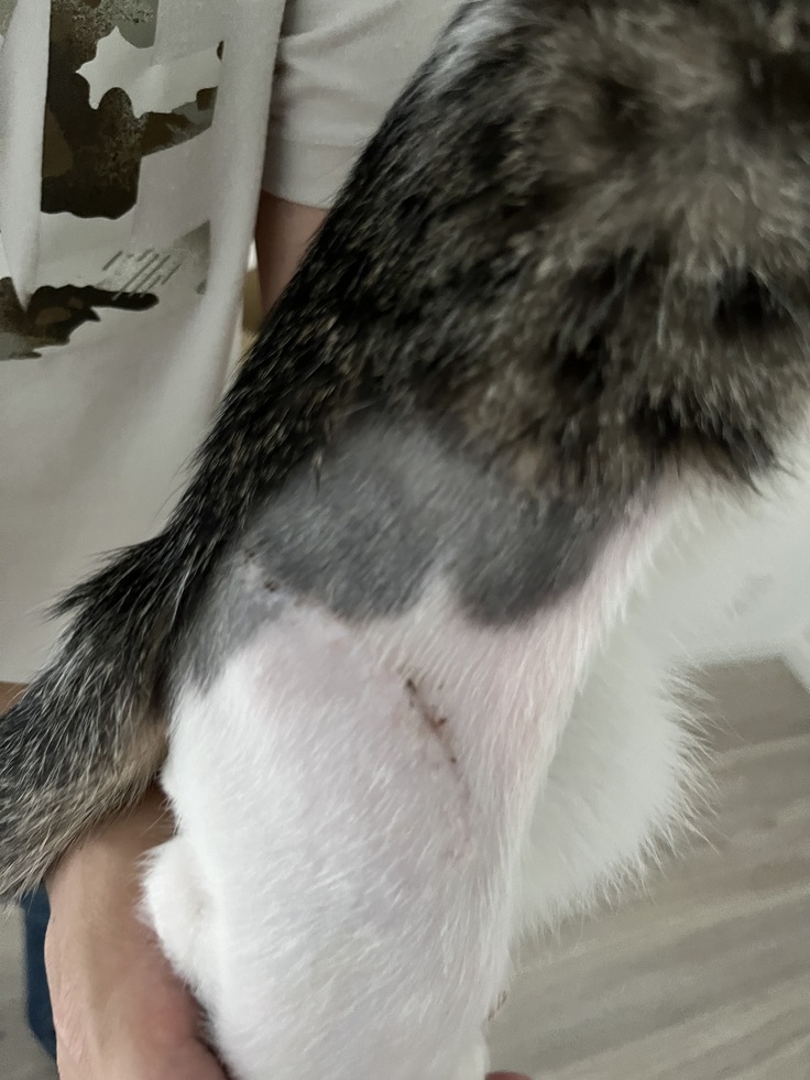 今日は手術後の抜糸と、三種混合のワクチン、回虫の検便を行いました。