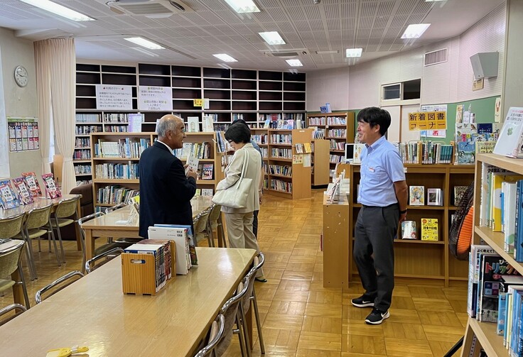 山中湖畔から少し通りを入ったところにある、全校で4クラスしかない小さな中学校ですが、校長先生や村の教育長さんも同席のもと、生徒代表の図書委員さんに直接手渡すことができました。
