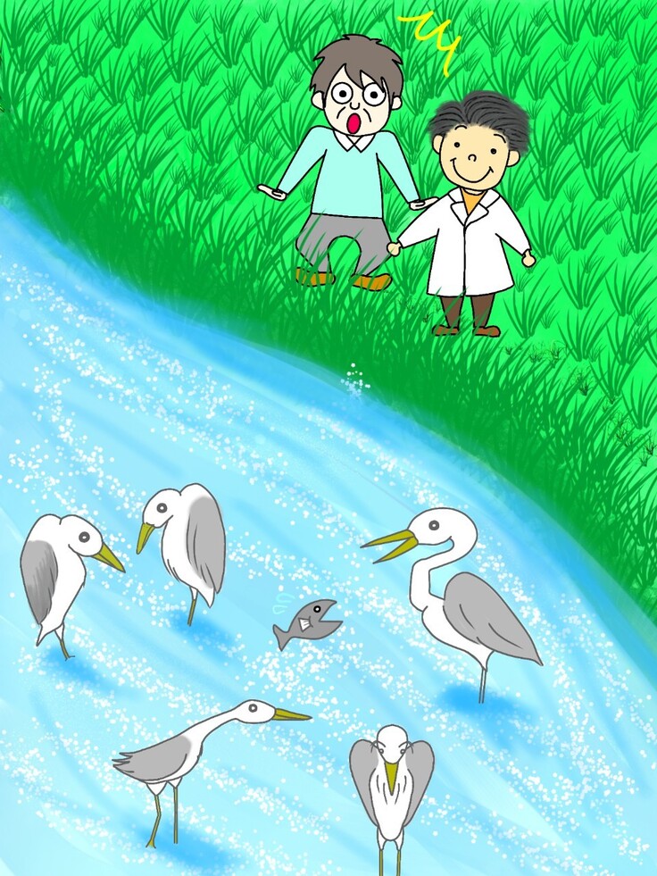 「この川は、ずっと汚れていて、魚もすくなかったんです。水がキレイになって 魚が戻ってきてくれて その魚をとりに こうしてたくさんの鳥たちがやってきたんです。」