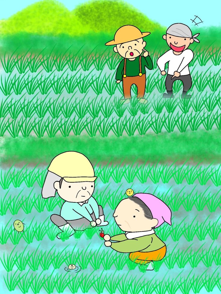 「あそこの畑は くすりもまかずに 米を育ててるんだってよ。