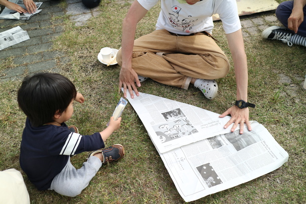 こどもの日にちなんだ今回のワークショップでは、新聞紙を使ってかぶとを折りました。