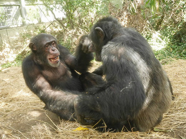 ユキオは、新入りのチンパンジーにも優しく、ダイチやケンボーが新しく熊本サンクチュアリにやってきたときには、それを優しく迎え入れました。一緒に追いかけっこしたりレスリングしたりしてよく遊んでいます。