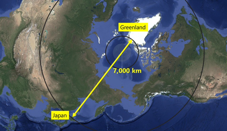 図1は、北極を中心に距離と方位が正しく表現された「正距方位図法」で描かれた地図です。日本の端とグリーンランドの端を結ぶと、直線距離で約7,000 km。東京と京都を新幹線で移動すると約500 kmですので、その14倍、つまり東京と京都を7往復したくらいの距離になります。