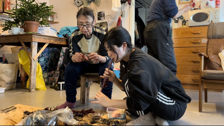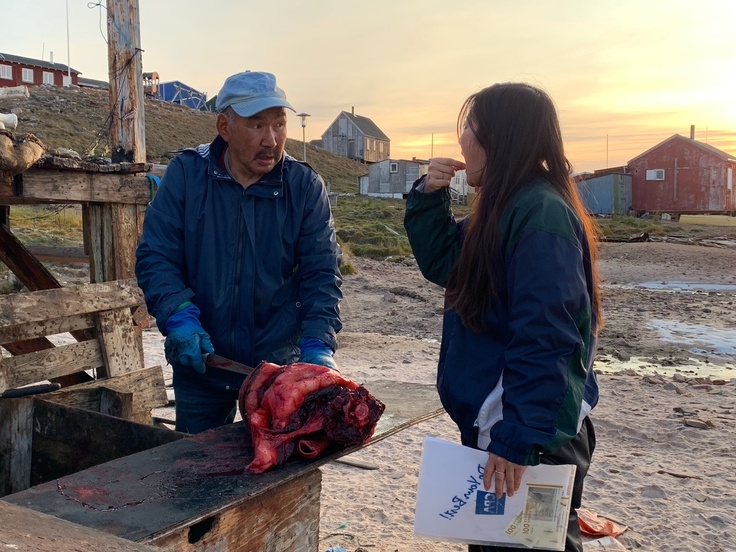 一緒にご飯を食べることです(アザラシに海鳥を詰めて発酵させたキビヤックを食べているところ.強めの塩辛みたいな味です).