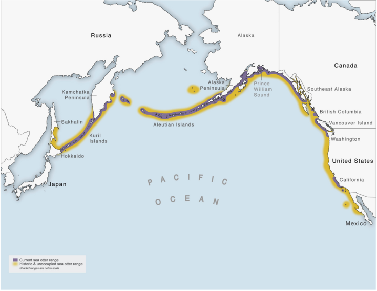 ラッコは、海の中でとても魅力的で、生態系にとって大切な動物のひとつです(図1)。18世紀から19世紀の毛皮貿易によって、ラッコの数は約30万頭からわずか2,000頭以下にまで減ってしまいました。しかし、国際的な保護と長年の努力により、現在では15万頭ほどにまで回復し、ロシアやアラスカ、カリフォルニアなど、かつての生息地の多くに戻ってきています。しかし、完全な回復と長期的な持続可能性の実現には、まだ課題が残っています(図 2)。