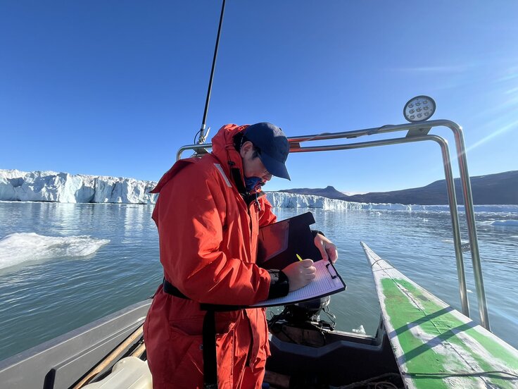写真1.目視調査中,発見したアザラシの情報を記録する様子