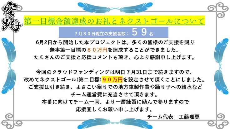 ※プロジェクト成立後、天災等やむを得ない事情(緊急事態宣言などコロナウイルスによる影響を含む)によりよさこい祭りが開催できなかった場合は、来年のよさこい祭りおよび関連イベントや遠征等(代替使途)に使用します。