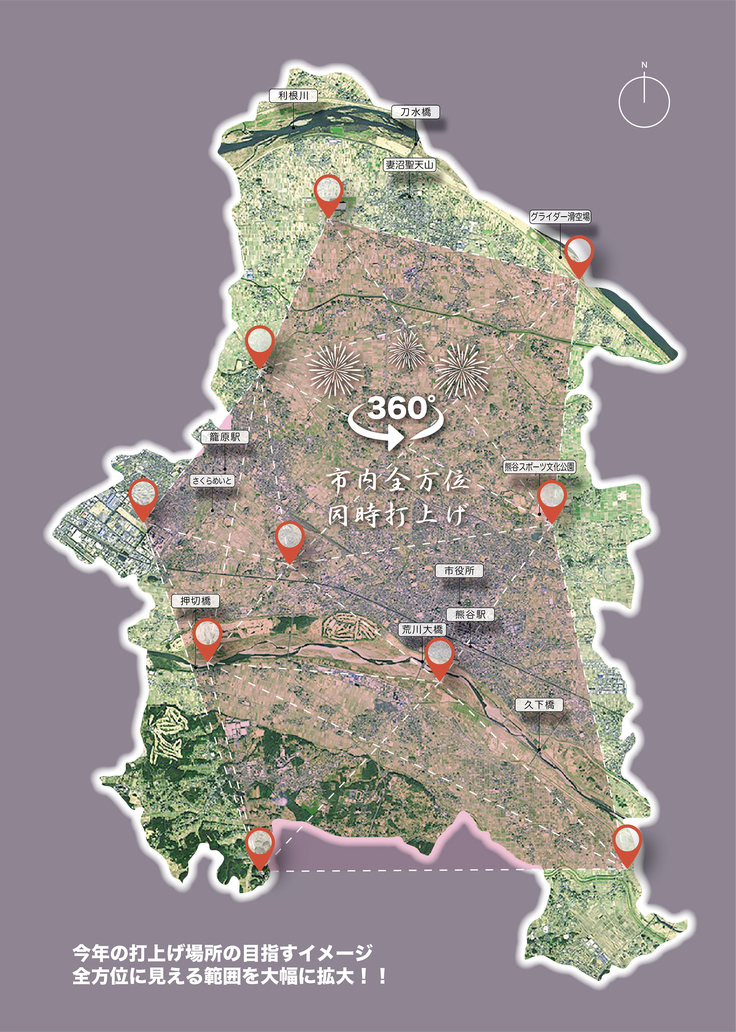 - 市内“全方位”同時打ち上げで「花火に包まれる」状態を目指します。