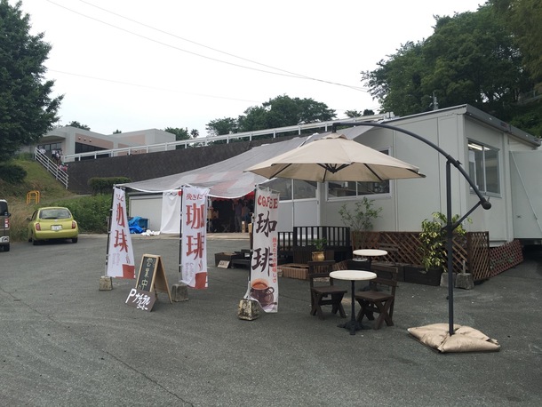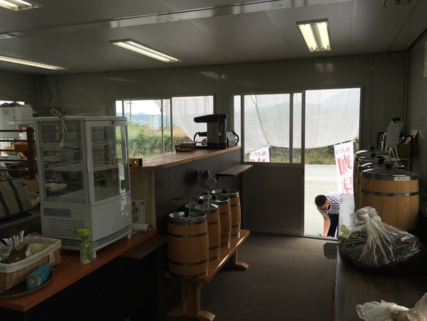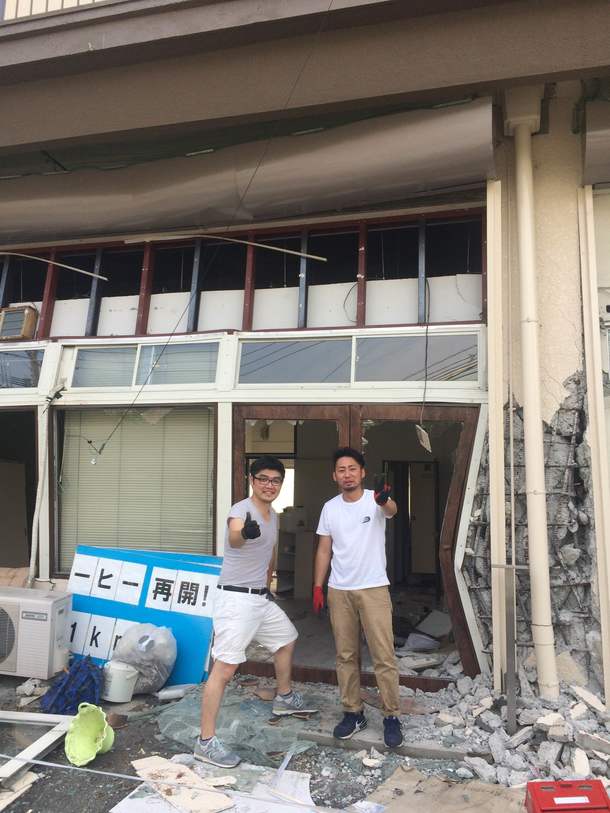 被災したカフェから必要なものを取り出し、あり合わせのもので、なんとか設営完了。