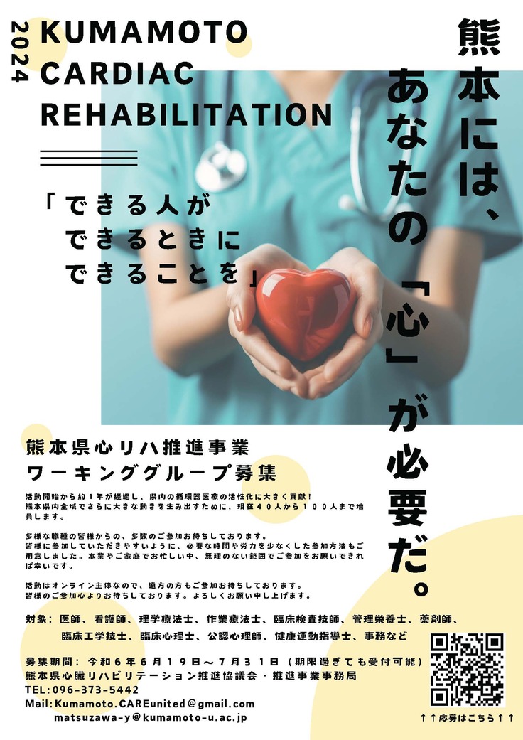 熊本県内心リハ実施している59施設みんなで熊本県内の診療体制向上に向けて努力しています。今後ともどうぞよろしくお願い致します。ワーキンググループ再募集期間が終了しましたが、今後もご参加希望の場合は個別に対応いたします。いつでもご連絡ください!