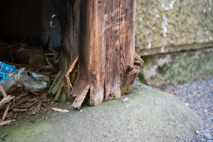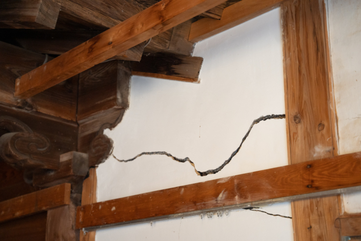 しかしながら実は、拝殿の壁や柱の各所にも傷みが見られ、修繕を要しています。また境内にはその他にも修繕を要している箇所が多数あり、例えば鐘楼については基礎が歪み、安全性が危惧される状態です。
