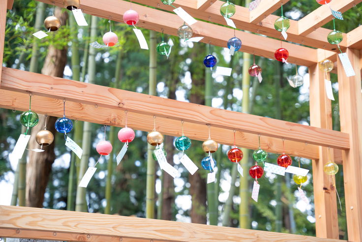 写真は夏祭り前に移動された風の音風鈴回廊とイチョウカフェスタッフのみんな。
